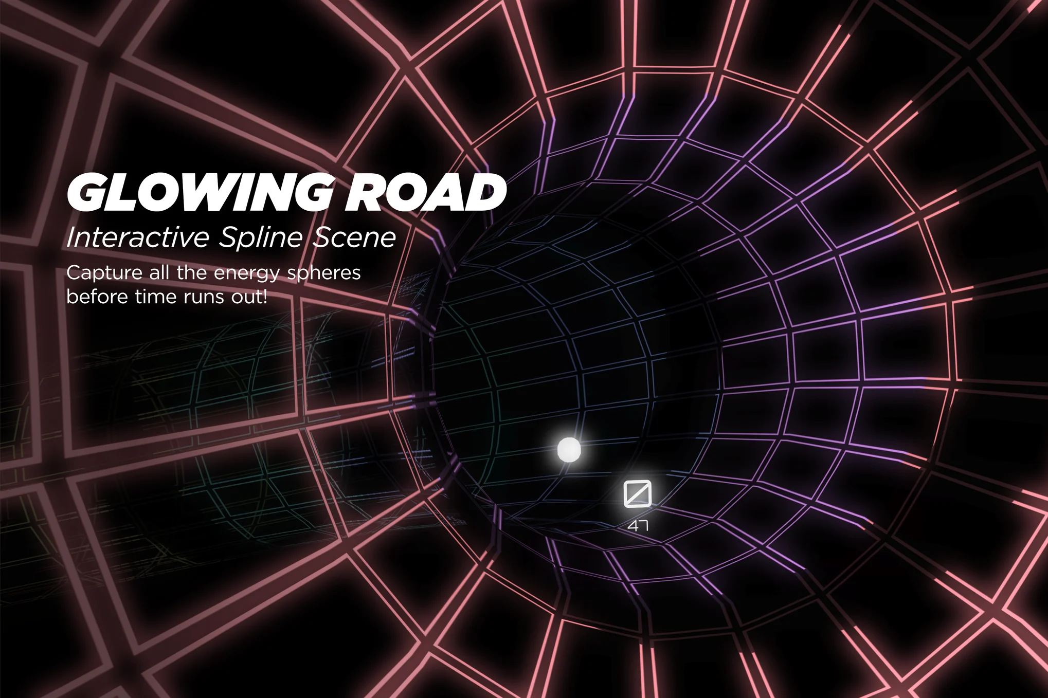 This scene showcases a glowing, neon tunnel with a retro-futuristic aesthetic, featuring a player-controlled orb navigating a spline-based path. The vibrant gridlines shift between pink, purple, and blue hues, creating a dynamic sense of depth and motion. A minimal UI displays score feedback, emphasizing the game’s focus on collecting energy spheres.